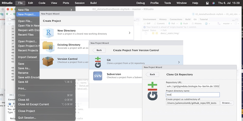 Fig. 2 Figures of several screenshots demonstrating the creation of new projects on Rstudio.¶