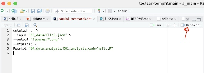 Then, Max create a bash script in Rstudio and run it using the usual button (This runs the bash script in the terminal). After some practice and tests, Max finds his way between testing/developing code on training data (as he has been used to, while using datalad unlock and datalad get when needed), and running ready code on real data in a reproducible way using datalad run.