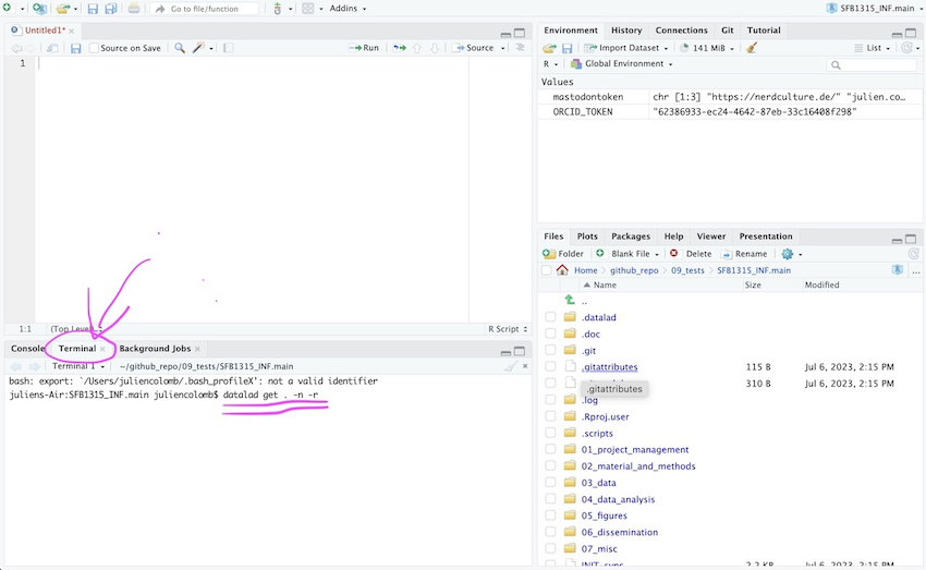 Fig. 3 Using Rstudio terminal window to give DataLad commands¶